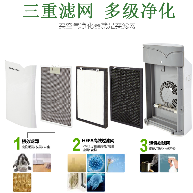 1.三重濾網(wǎng)七級凈化:置有初效過濾層、高效HEPA過濾層和活性炭過濾層,高效凈化空氣。